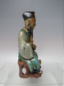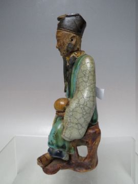 A CHINESE POLYCHROME FIGURE OF AN ELDER HOLDING A PEACH, A/F, H 19.5 cm