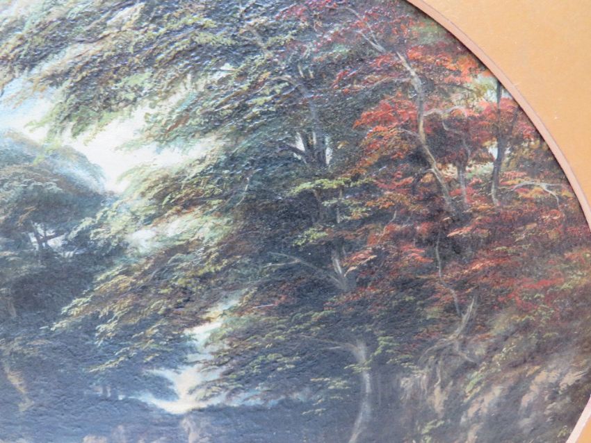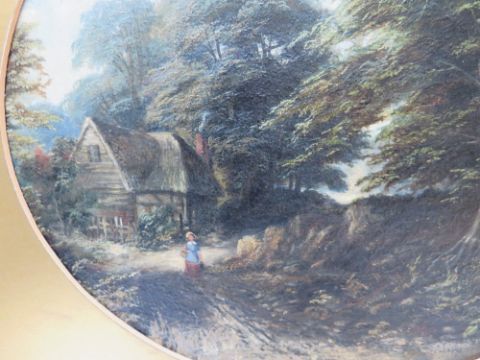 WILLIAM STONE (XIX). English school, oval wooded rural landscape with figure on a path before a cottage, signed verso, oil on panel, unframed, 24 x 28 cm