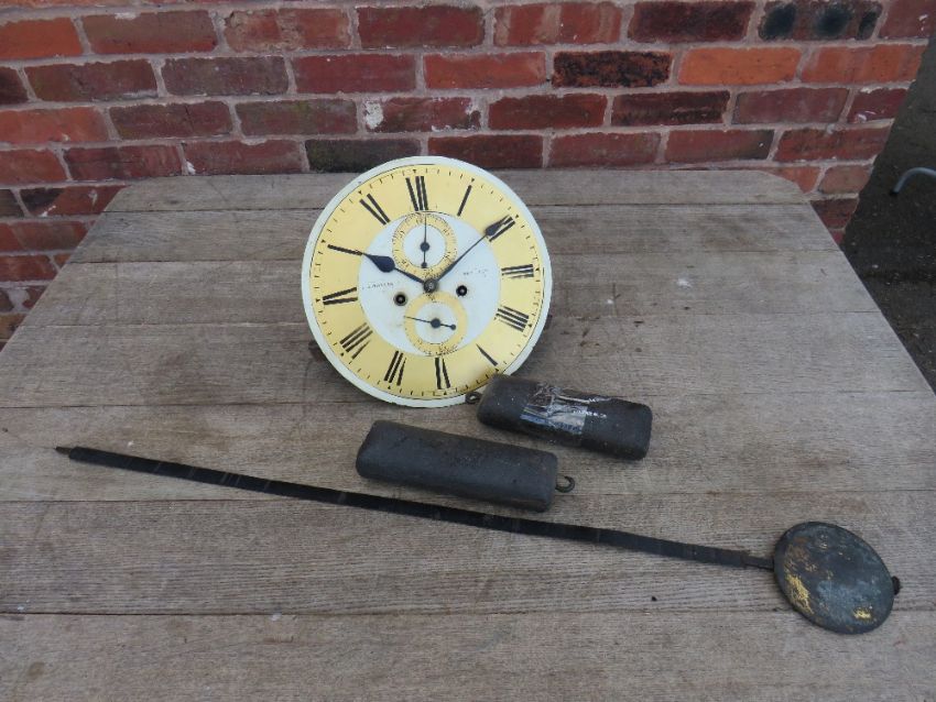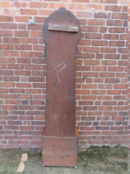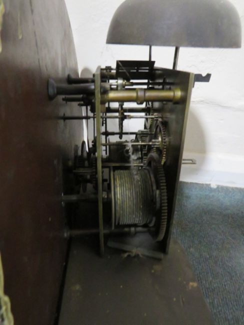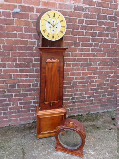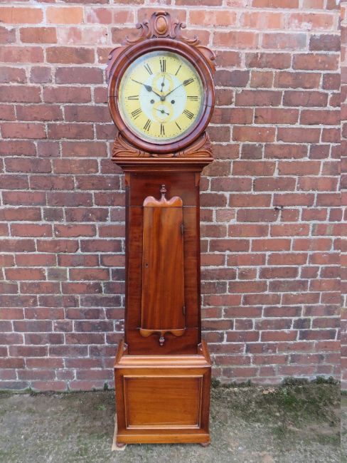 A 19TH CENTURY SCOTTISH MAHOGANY LONGCASE CLOCK BY JAMES WISEMAN OF HAMILTON, the painted and gilt circular dial with subsidiary dials for seconds and days, the eight day movement striking on a bell, drum head case over tapering trunk with long waisted door, raised on a plinth base, H 204 cm, twin weights and pendulum