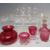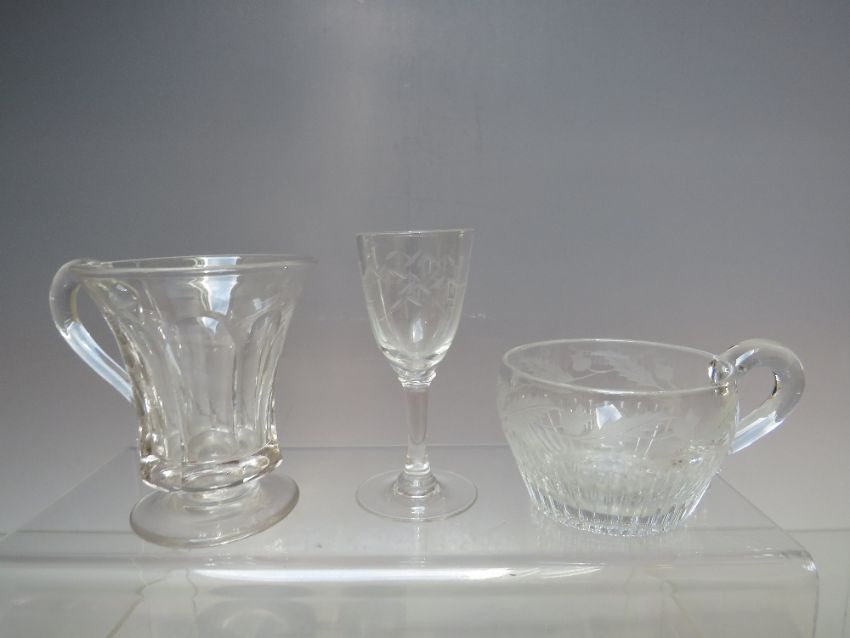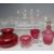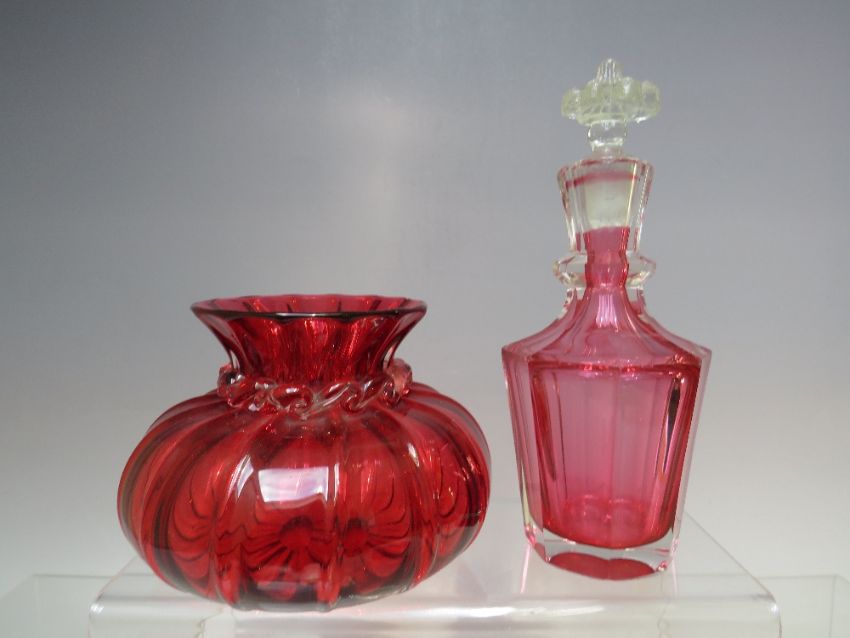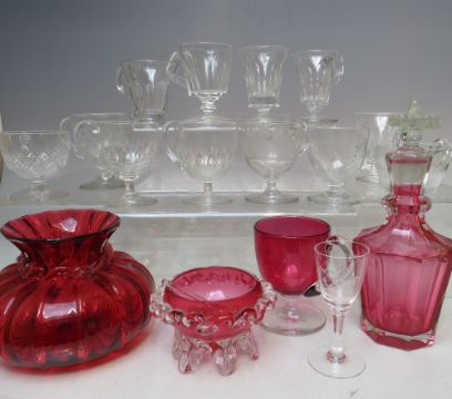 FOUR ITEMS OF VICTORIAN CRANBERRY GLASSWARE, to include a faceted glass bottle with stopper, together with a collection of twelve antique and later custard cups, various styles and periods etc. (17)