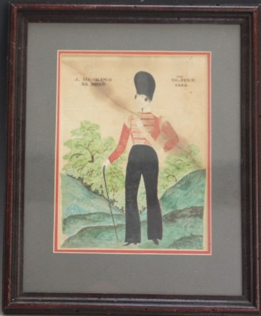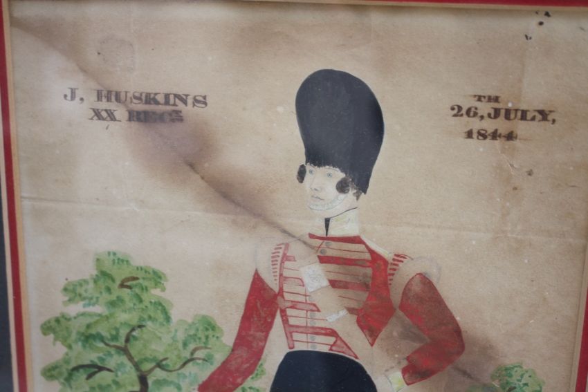 J. HUSKINS. Military study of an officer in a rocky wooded landscape, signed upper left and dated 1844 upper right, watercolour, framed and glazed, 24 x 18 cm