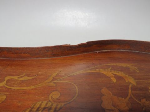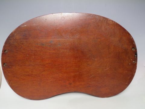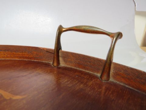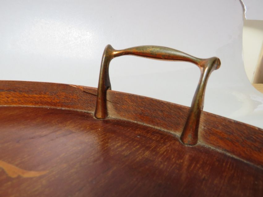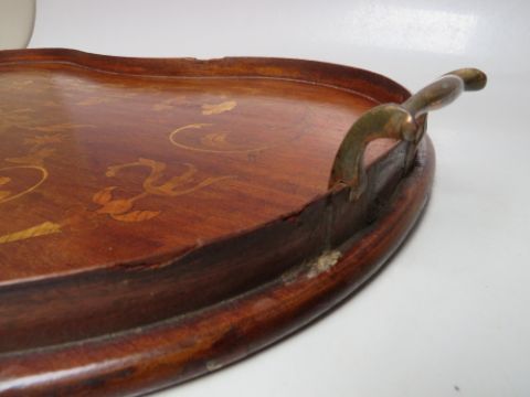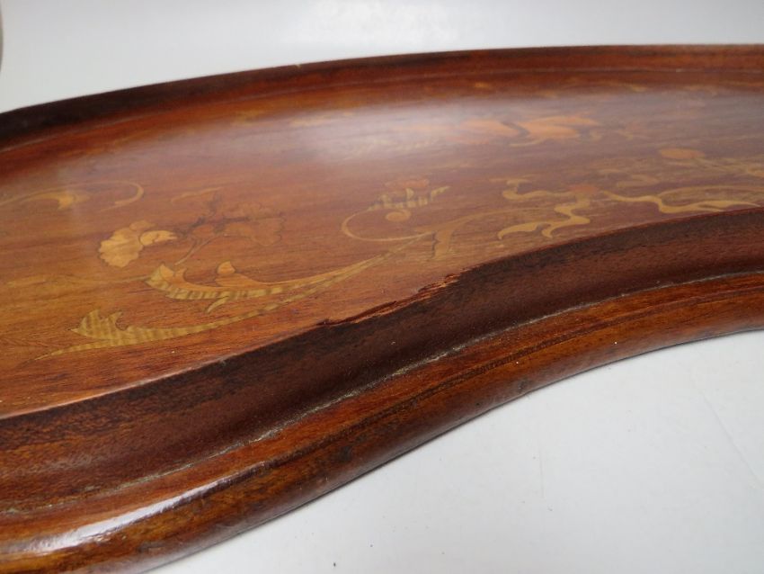 AN EDWARDIAN MAHOGANY AND MARQUETRY INLAID KIDNEY SHAPED TRAY, with twin brass handles and galleried border, approx W 67 cm S/D
