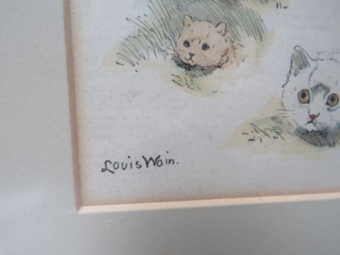 LOUIS WAIN (1860-1939). A coloured antique print 'Sketches of The Cat Show at The Crystal Palace', signed in plate, framed and glazed, 33 cm x 23 cm