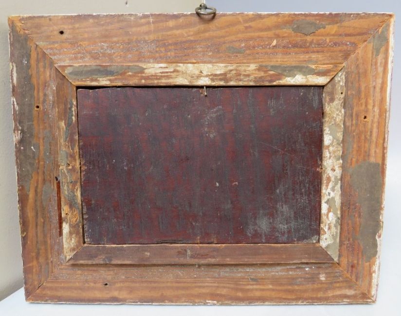 (XIX). Study of chickens in a farmyard, indistinctly signed under slip lower right, oil on panel, framed, 11 x 17 cm
