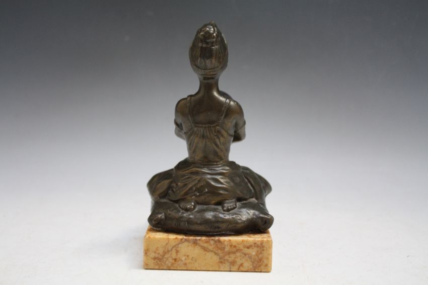A CLASSICAL ART DECO BRONZED STYLE FEMALE KNEELING HOLDING A CIRCULAR DERBYSHIRE BLUE JOHN GLOBE IN BOWL, set on a shaped rectangular marble base, H 16 cm