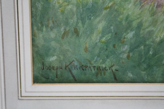 JOSEPH KIRKPATRICK (1872-1930). A rural cottage scene with young woman with two calves by a blossom tree 'Blossom Time;, see verso, singed lower left, watercolour, framed and glazed, 46 x 34 cm
