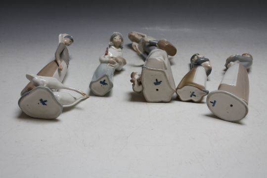 A SELECTION OF FIVE LLADRO FIGURES WITH ANIMALS, comprising three lady figures, one with a goose, a lamb and a puppy and two children, one with a piglet, the other a chicken, gloss finish, impressed and printed marks to base, tallest H 28 cm