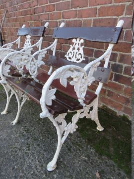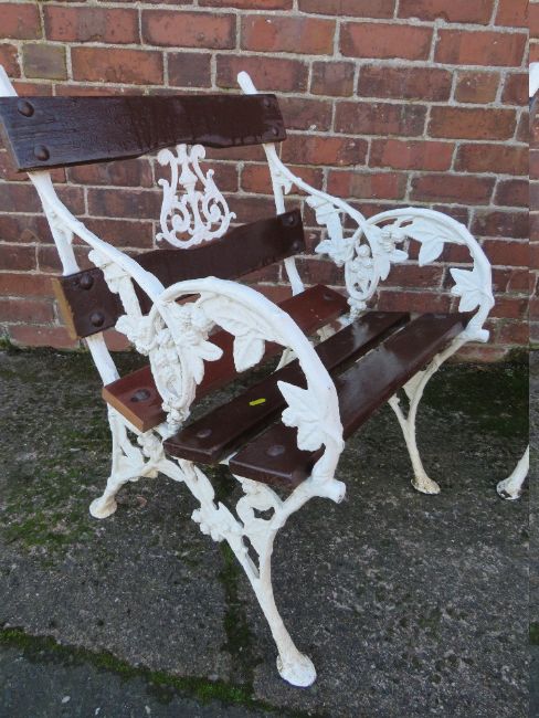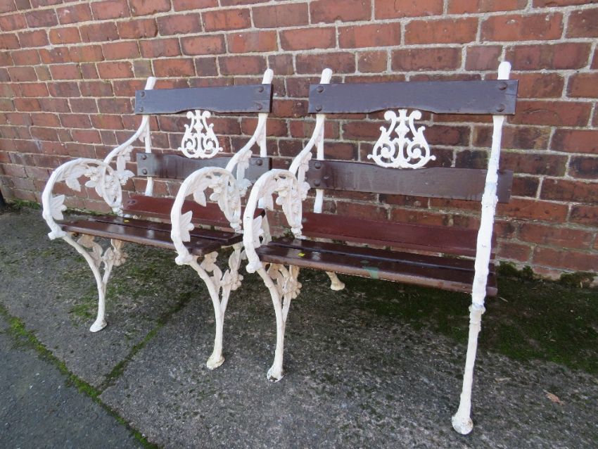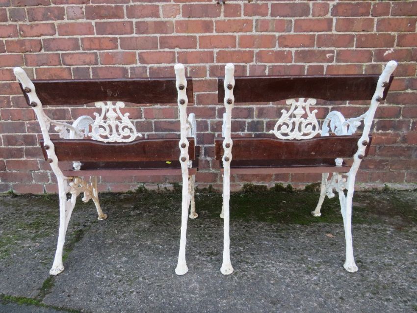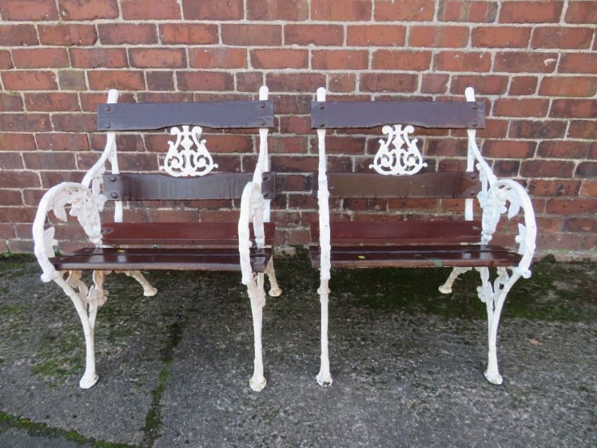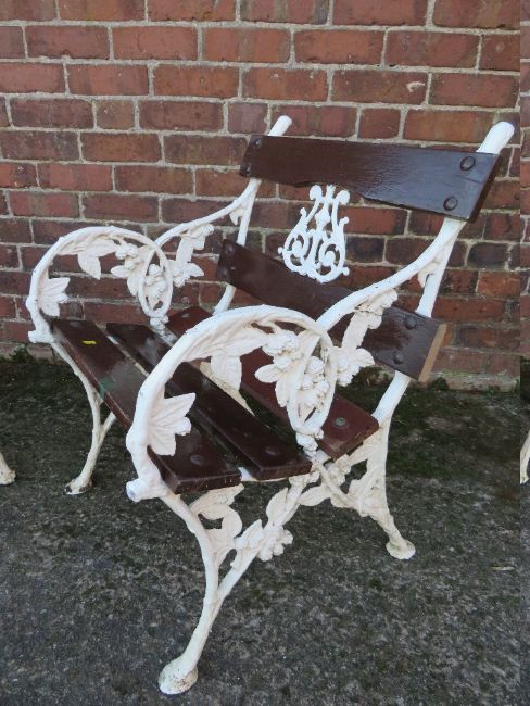 PAIR OF LATE CAST IRON CHAIRS, with ornate floral embellishment, each W 63 cm, H 82 cm, D 60 cm