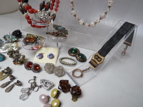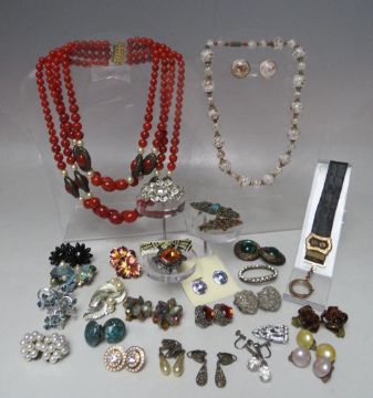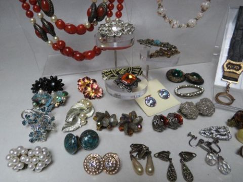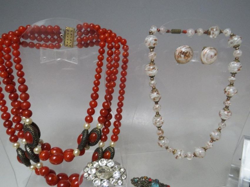 A COLLECTION OF VINTAGE COSTUME JEWELLERY, to include an Italian Murano glass beads and earrings set, a selection of brooches and numerous pairs of earrings, some marked examples stamped Western Germany, Sarah Cov and Miracle (Approx 24)