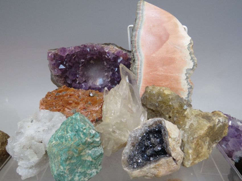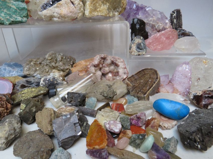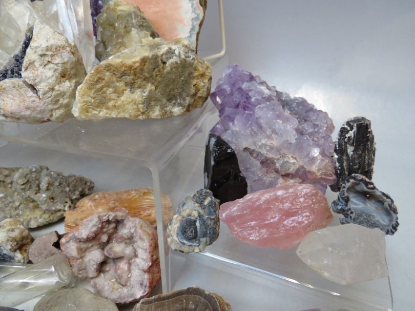 A GOOD SELECTION OF ASSORTED GEOLOGICAL SPECIMENS TO INCLUDE GEMSTONES, ROCK, FOSSILS AND MINERALS ETC.