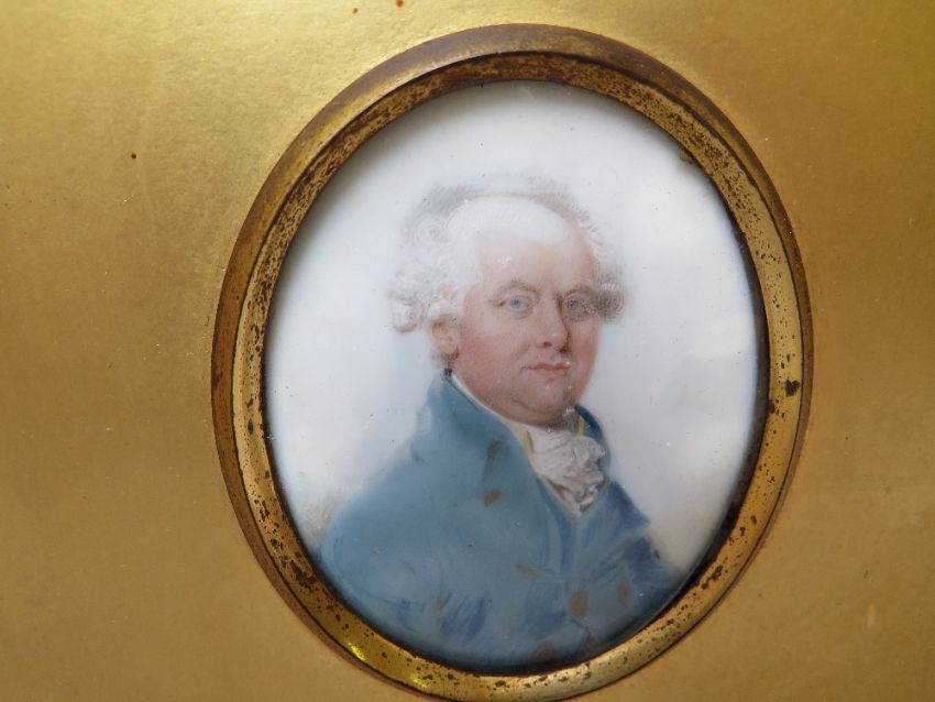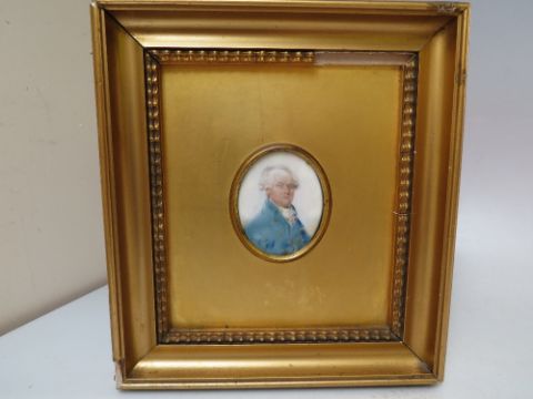(XIX). Oval portrait miniature of ivory of Major G.W.Shewell in a light blue jacket, unsigned, framed and glazed, 5.5 x 4.5 cm
