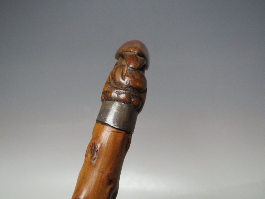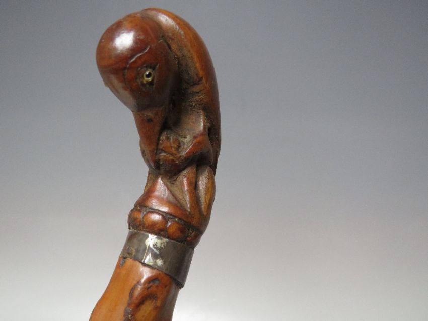 A WALKING CANE WITH A MATCHED CARVED HANDLE IN THE FORM OF A BIRD PECKING AT FRUIT, L 77 cm