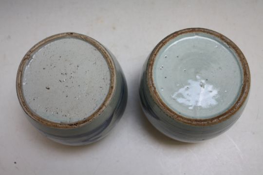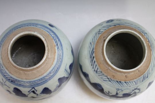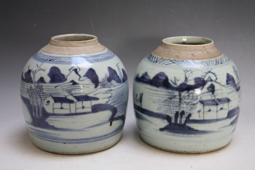 A PAIR OF CHINESE BLUE AND WHITE VASES, decorated with rural scenes, H 16 cm
