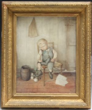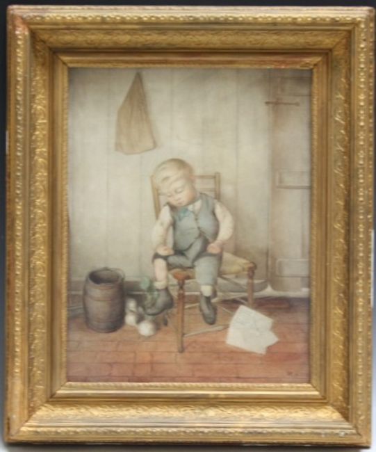 W. HUNT (XIX). British school, cottage interior with young boy sat on a chair, signed lower right, watercolour, framed and glazed, 34 x 26 cm
