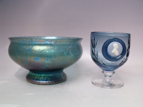 A ROYAL BRIERLEY STUDIO DESIGN IRIDESCENT PEACOCK LUSTRE GLASS BOWL, marked to base, Dia 20 cm, H 12 cm, together with a Wedgwood glass goblet, having jasperware cameo depicting HRH Prince Charles, dated to base 1952, H 13.3 cm (2)