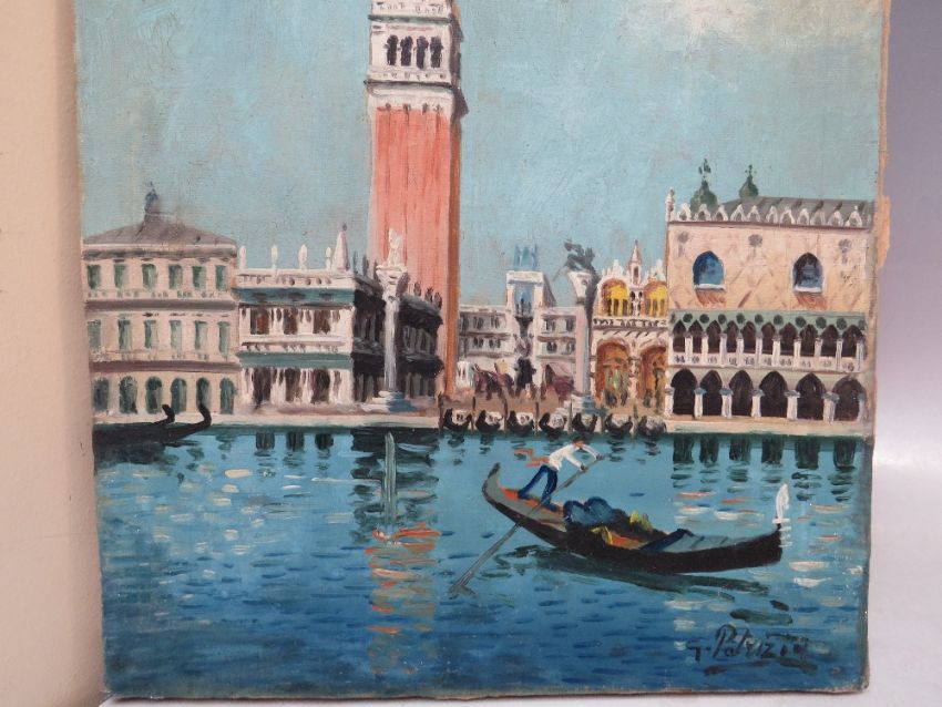 G. PATRIZIO (XX). Italian school, Venetian scene with gondola and gondolier, signed lower right, oil on canvas, unframed, 40 x 30 cm