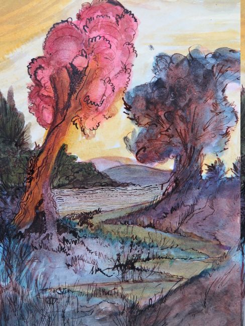 CIRCLE OF JOHN PIPER (1903-1992). A wooded landscape with hills beyond, bears signature lower right, mixed media on paper, unframed, 25 x 17 cm
