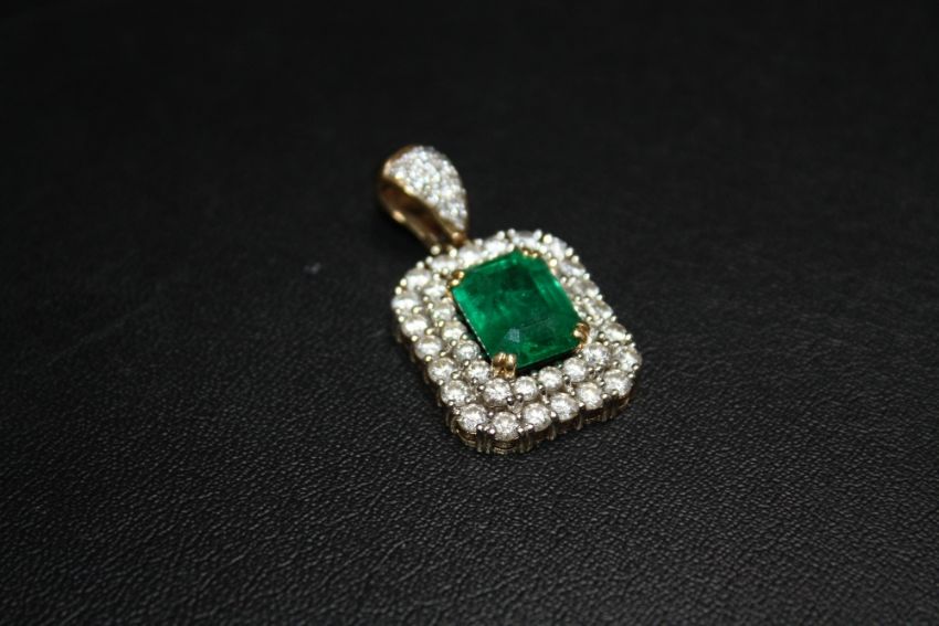 AN EMERALD AND DIAMOND ART DECO PENDANT, set with a central emerald cut emerald of an estimated 3.5 carats and surrounded by two layers of brilliant cut diamonds totalling approx 1.66 carats, H 3 cm