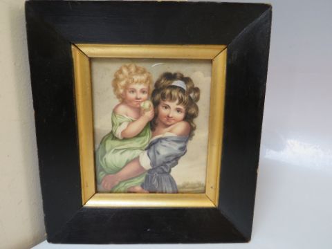 (XIX). A miniature study of two children, one eating an apple, landscape beyond, watercolour, framed and glazed, 12 x 10 cm