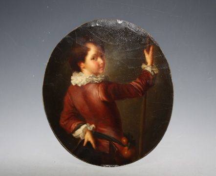 (XVIII-XIX). Italian school oval study of a boy in red holding a staff, unsigned,oil on paper laid on panel, unframed, 28 x 24 cm