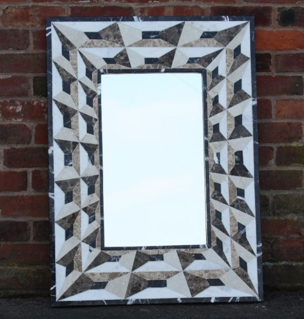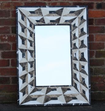 AN ART DECO STYLE TROMP L'OEIL INLAID MARBLE SURROUND MIRROR, mirror size 60 x 35 cm, overall size 101 x 74 cm