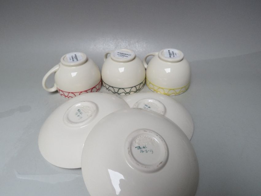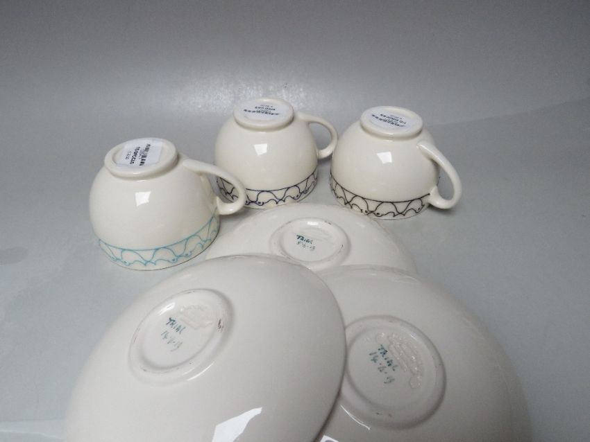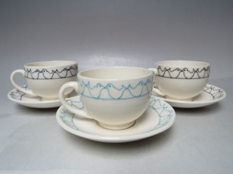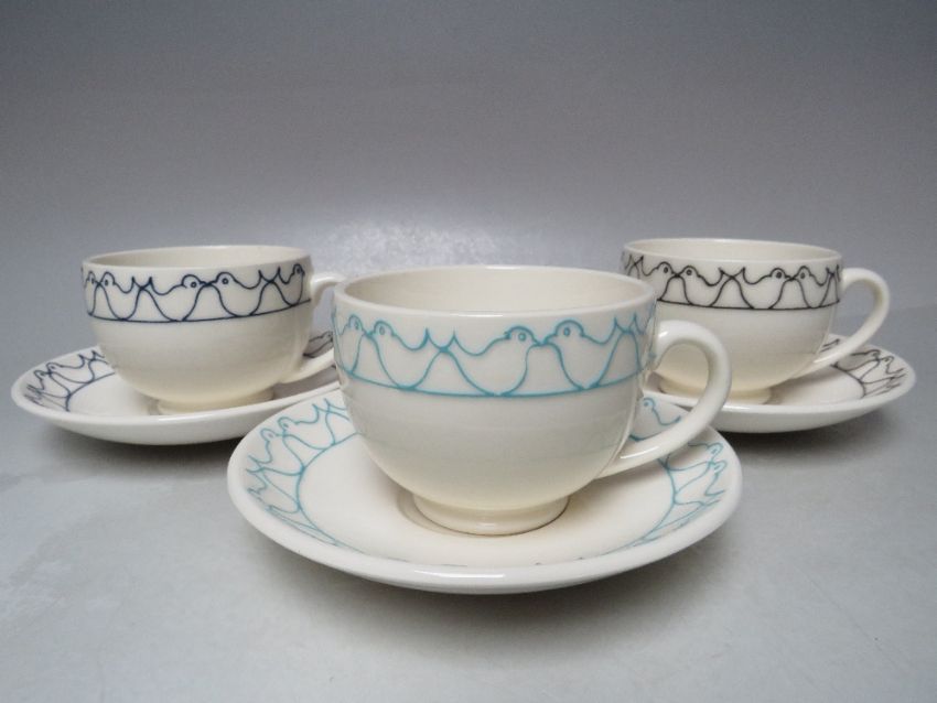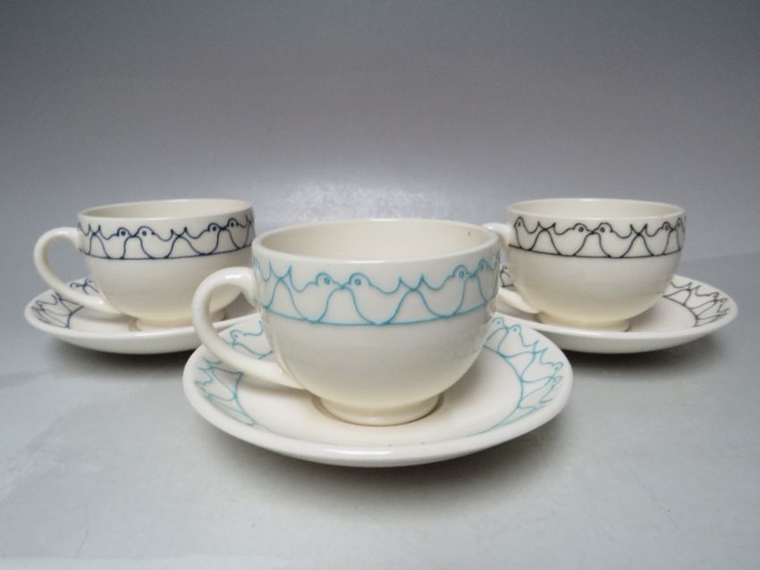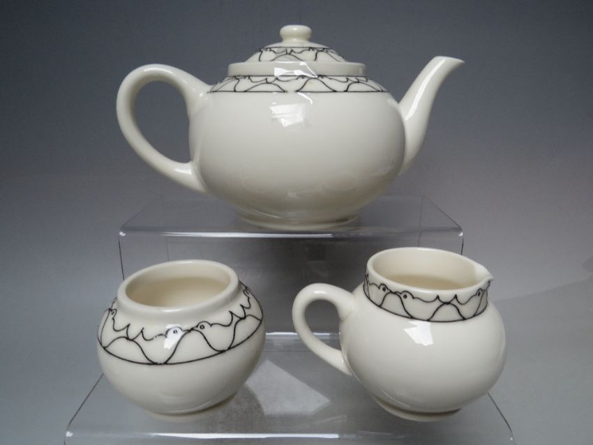 A MOORCROFT POTTERY TRIAL DESIGN 'BIRD' PATTERN TEASET, cream ground with tubelined decorative border, comprising tea pot, milk jug, sugar bowl and six cups with six matching saucers, teapot W 23 cm, H 12 cm