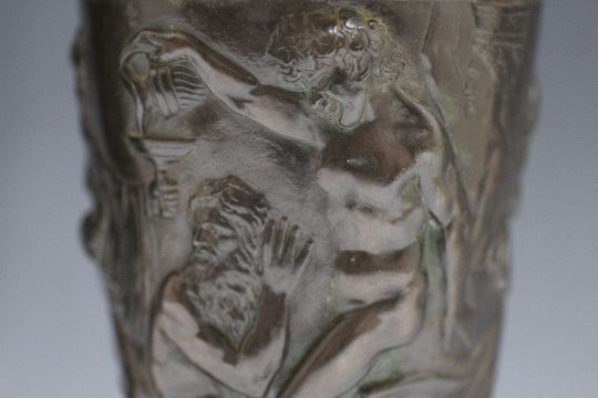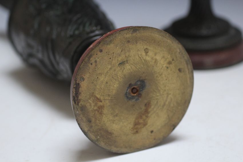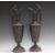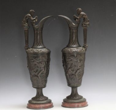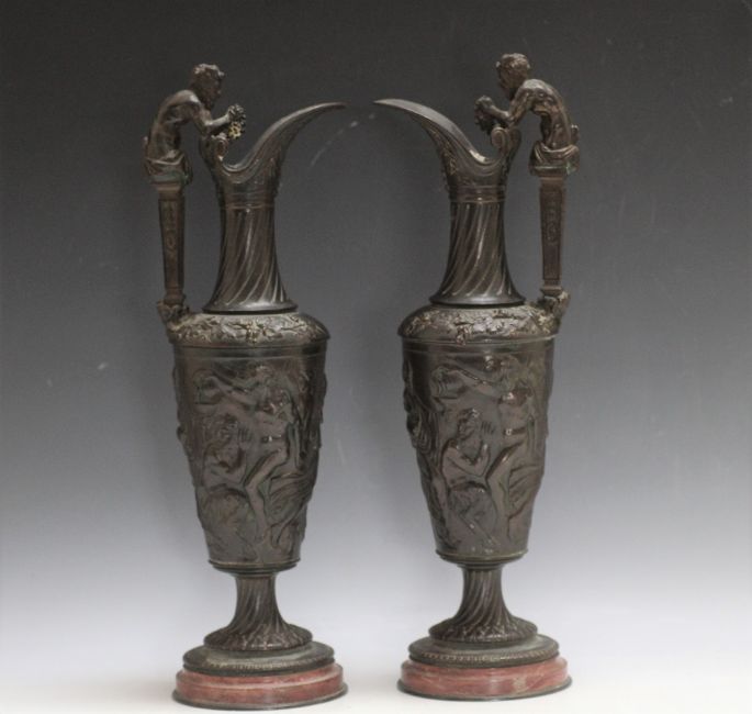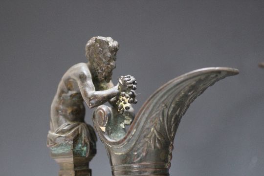 A PAIR OF BRONZE BACCHUS EWERS, seeing Bacchus squeezing a bunch of grapes into the ewer as he emerges from the handle, the central relief showing drinkers revelling, H 43.5 cm