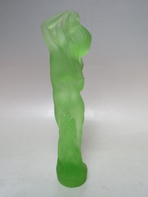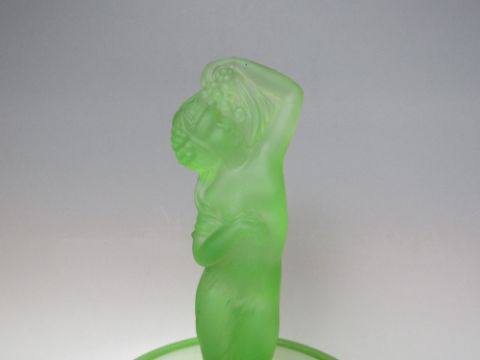A WALTHER & SOHNE STYLE URANIUM GLASS FIGURAL CENTREPIECE, raised on an associated black glass plinth, bowl Dia. 25 cm, overall H 34 cm