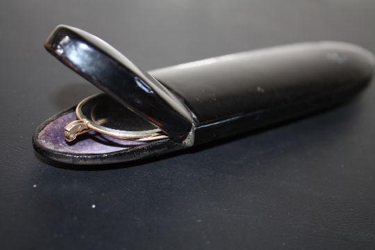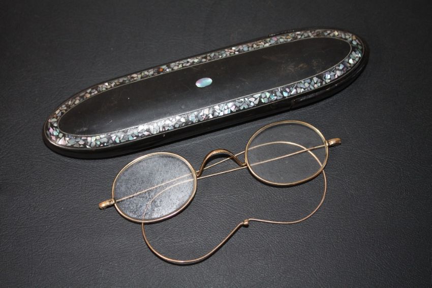 A PAIR OF GOLD RIMMED SPECTACLES IN A MOTHER OF PEARL INLAID CASE, W 15.5 cm