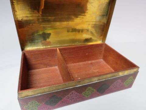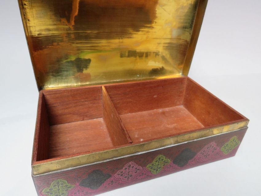 AN INDIAN ENAMELLED BRASS BOX WITH A VIEW OF THE 'TAJ MAHAL', the domed, hinged lid opening to reveal partitioned interior, W 22.5 cm, D 12.5 cm, H 8.5 cm