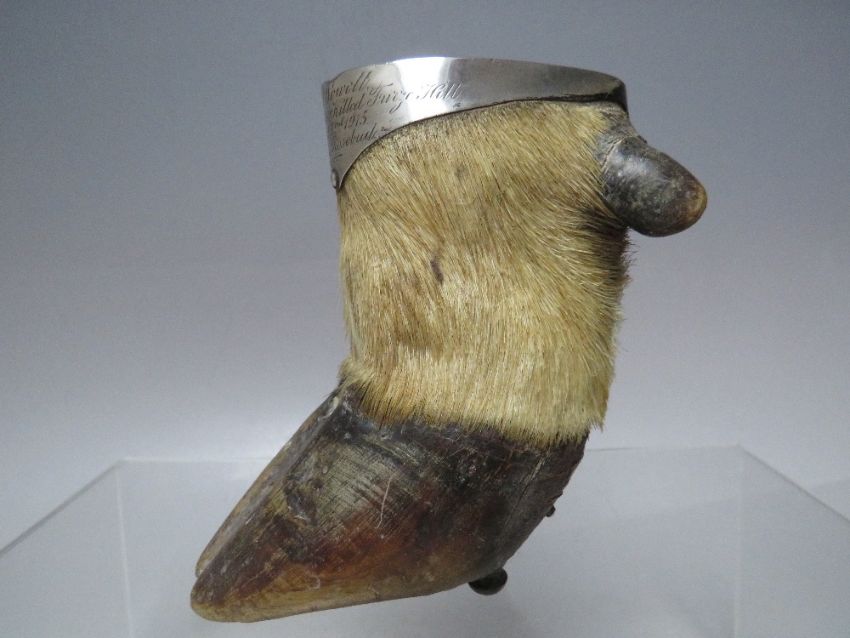 A STERLING SILVER MOUNTED DEER FOOT TABLE VESTA DATED 1915, with engraving of hunt details that lasted 3 3/4hrs starting out at Hele Bridge on September 22nd, H 11.25 cm