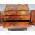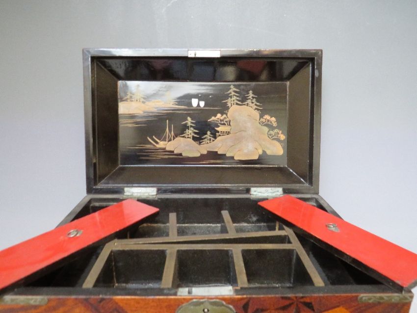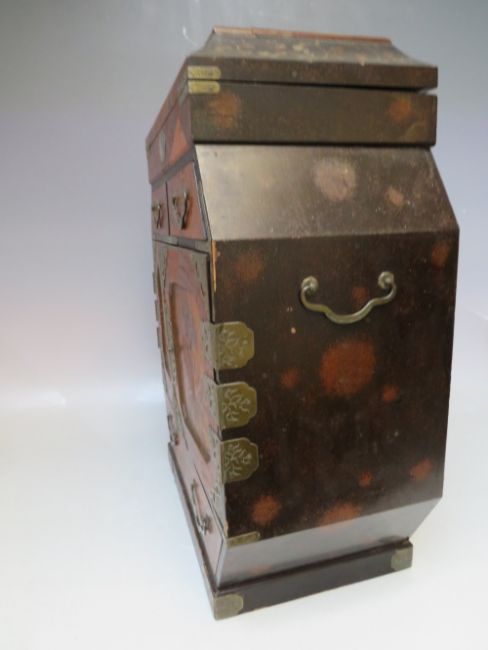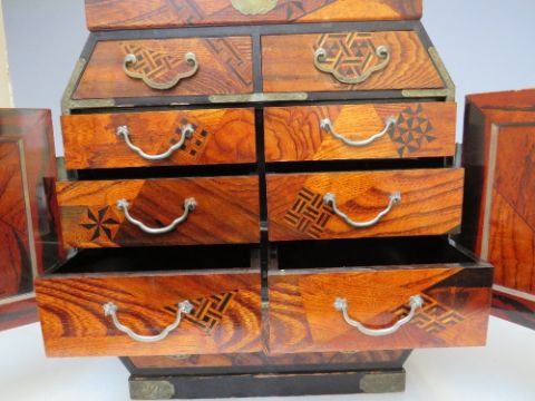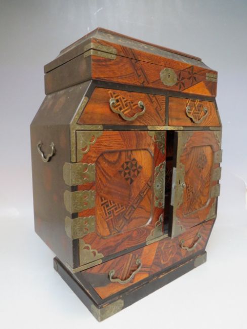 AN ORIENTAL STYLE INLAID TABLE CABINET, the hinged lid opening to a fitted interior, two small drawers below, the two larger doors opening to six drawers, a larger drawer to the base, brass engraved mounts and inlaid decoration throughout, H 43 cm, W 35 cm, D 17 cm