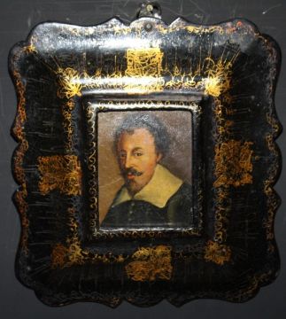 (XVII-XVIII). A portrait miniature study of a gentleman with moustache and beard, framed in a decorative papier mache frame, unsigned, oil on board, framed, 6.5 x 5 cm