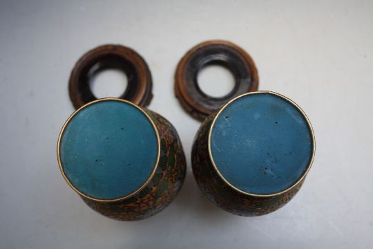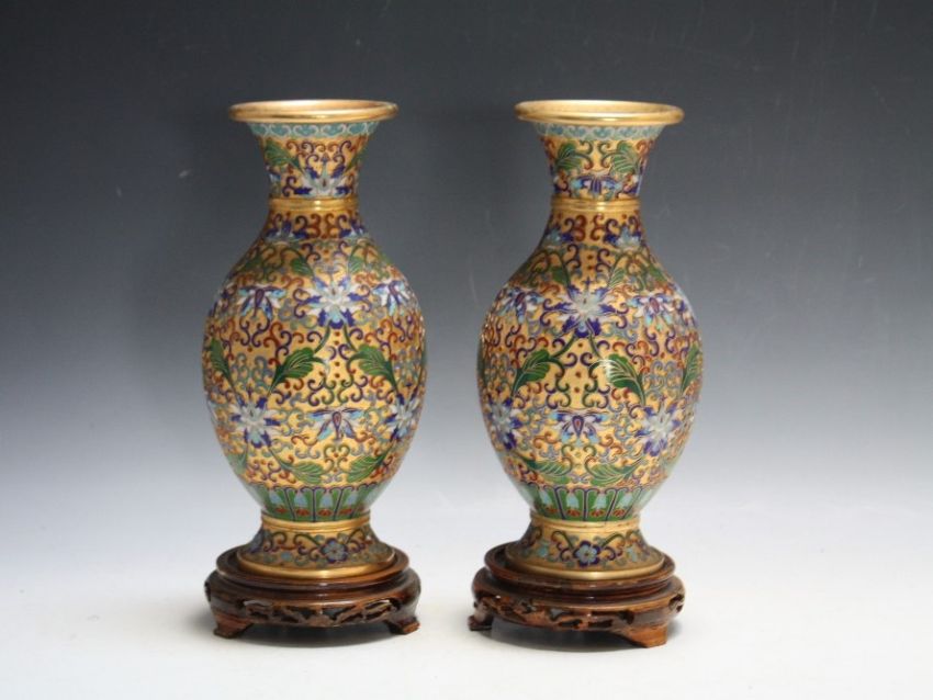 A PAIR OF ORIENTAL TYPE CLOISONNE VASES, on hardwood bases, H 27 cm