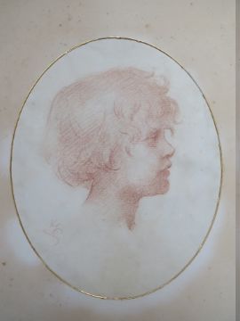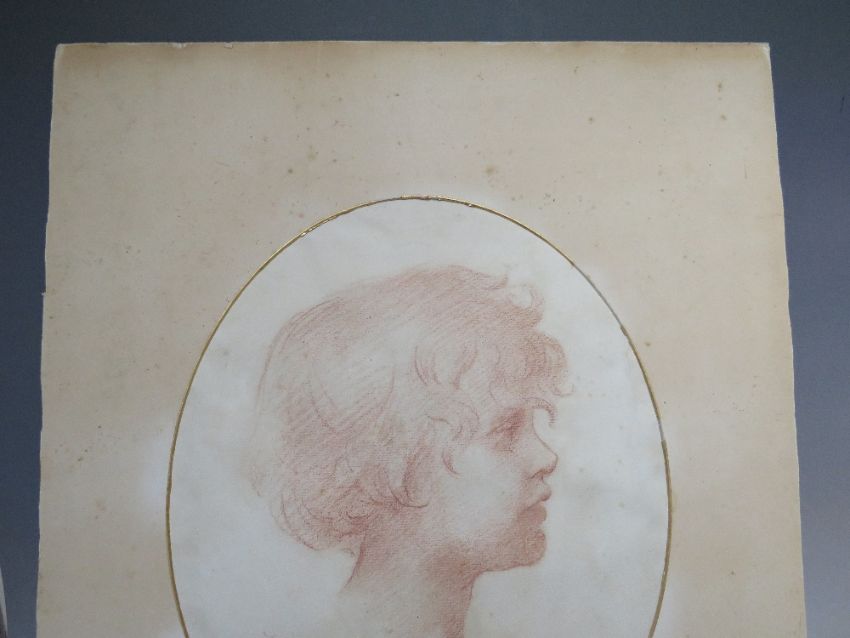 EARLY PRE-RAPHAELITE STYLE, oval head study of a young child, signed with monogram middle to lower left, red chalk on paper, unframed, 32 x 26 cm