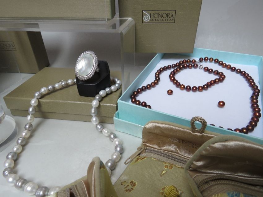 A COLLECTION OF HONORA PEARLS JEWELLERY ITEMS, comprising three necklaces, four pairs of earrings, a dress ring and a pair of 'HappyBacks', mostly boxed, together with a similar necklace, bracelet and earring set