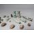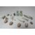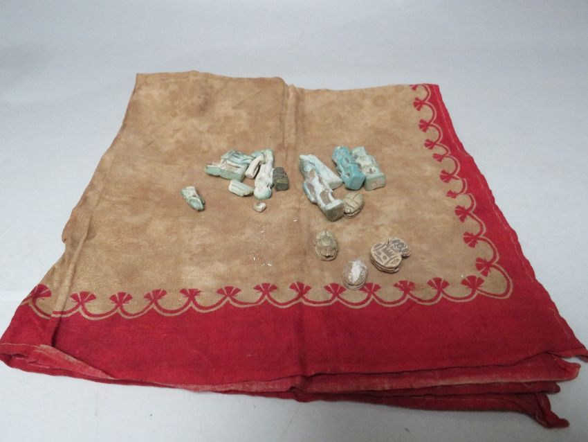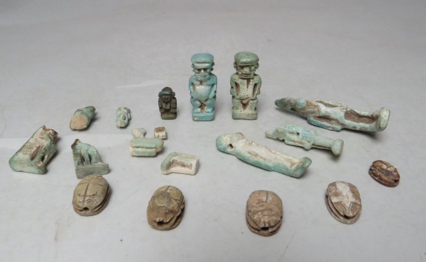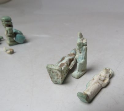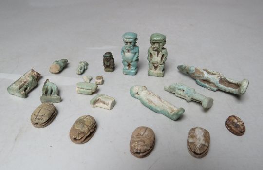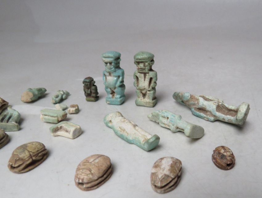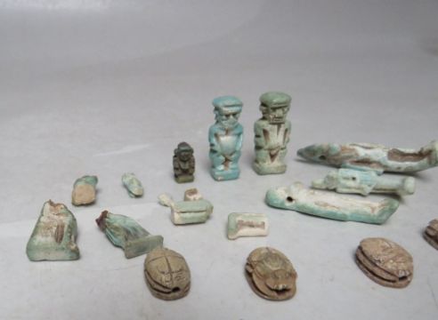 A COLLECTION OF EGYPTIAN SHABTI ETC., comprising a selection of small blue / green faience mummiform figures - some A/F together with a selection of stone scarab beetles