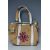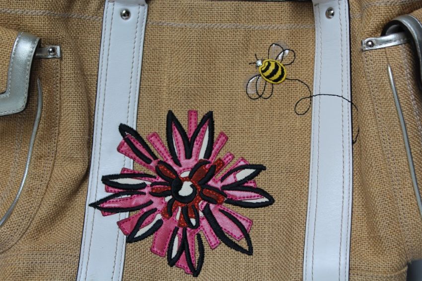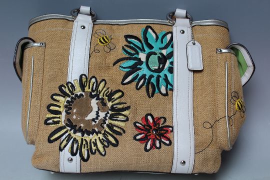 A COACH LINEN HANDBAG, open topped with flat leather handles, stitched floral detailing, two exterior pockets to the ends, dust bag, H 25 cm, W 35 cm