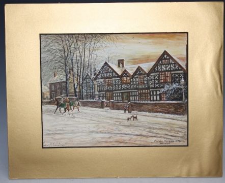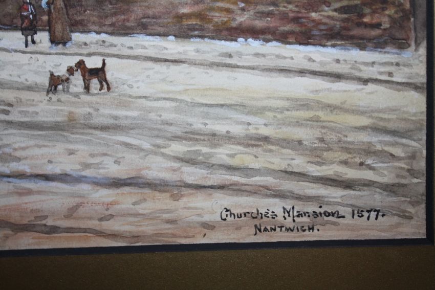 HERBERT ST. JOHN JONES. Winter street scene 'Church and Mansion, Nantwich 1877', signed lower left, watercolour, unframed, 21 x 28 cm