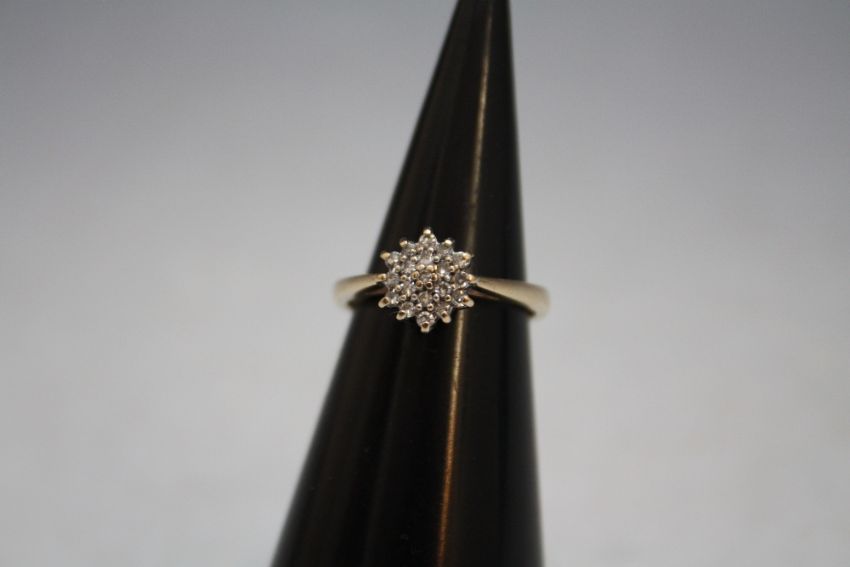 A 9 CARAT GOLD DIAMOND CLUSTER RING, approx weight 2.4g, ring size J