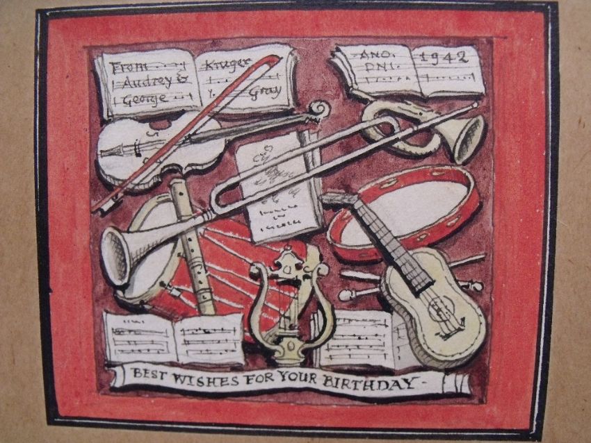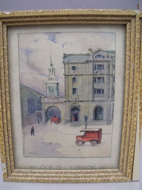 GEORGE EDWARD KRUGER GRAY (1880-1943). Original study for a birthday card with various musical instruments, signed upper left to middle and dated 1942 upper right, watercolour, unframed, 8 x 10 cm, together with L.A.P. A street scene with Royal Mail van and figures, signed with initials and dated 1917 lower left, watercolour, framed and glazed, 10 x 8 cm (2)