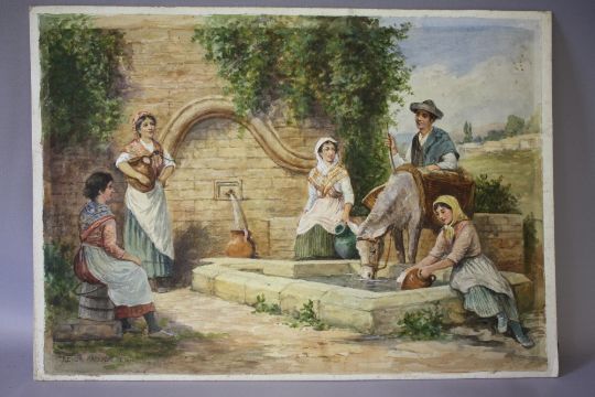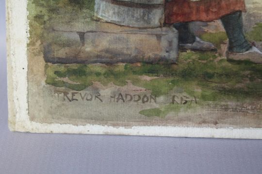 ARTHUR TREVOR HADDON (1854-1941). Continental landscape with figures and mule by a well, signed lower left, watercolour, unframed, 39 x 54 cm