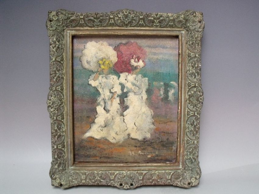 (XX). Impressionist scene with figures holding parasols, signed lower right, oil on card laid on board, framed, 28 x 23 cm