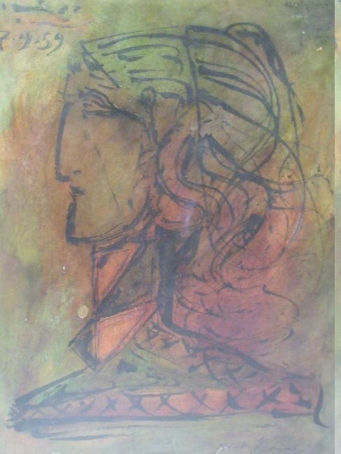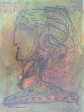 CIRCLE OF PABLO RUIZ PICASSO (1851-1973). Spanish school, modernist head and shoulder figure study, bears signature and date 1959 upper left, pen and ink on card, unframed, 51 x 39 cm