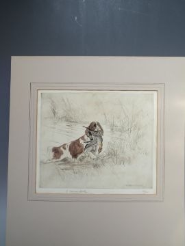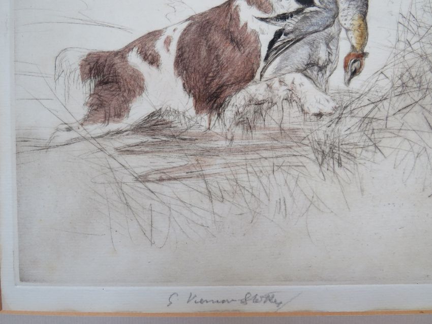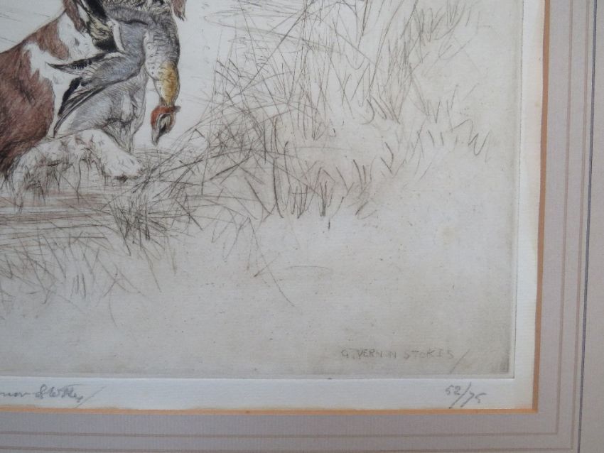 GEORGE VERNON STOKES (1873-1954) study of a springer spaniel fetching a game bird from the lake, signed lower left to middle in pencil, limited edition coloured etching on paper 52/75, unframed, 25 x 29 cm