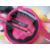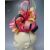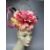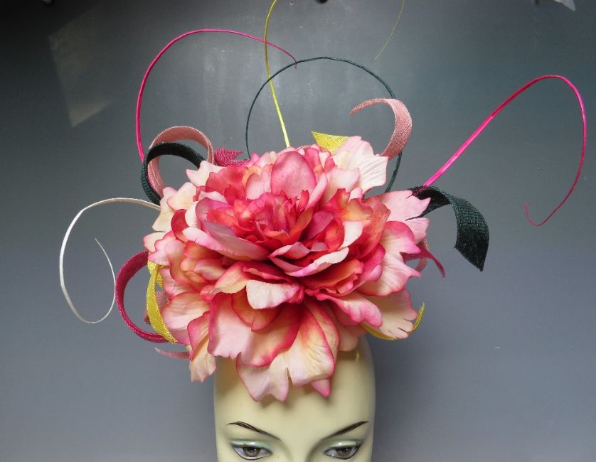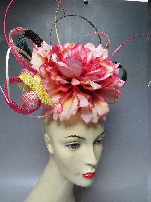 A HANDCRAFTED FASCINATOR BY K J MILLINERY, large central flower with matched ribbon style embellishment in shades of pink, black and yellow