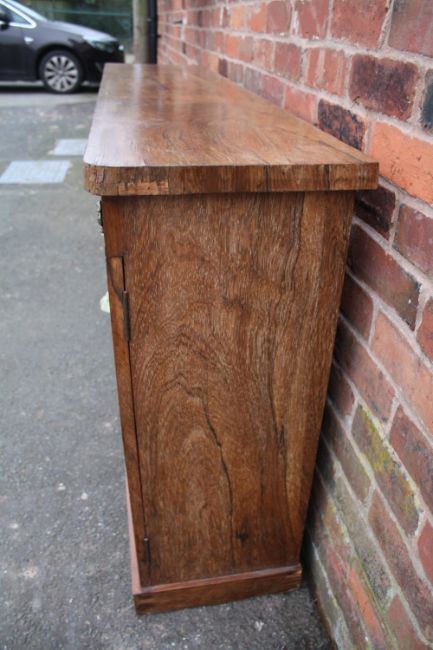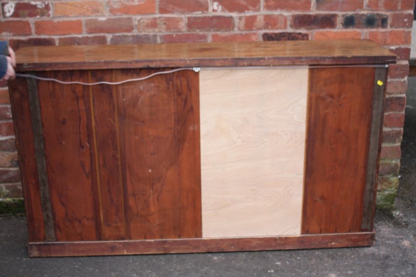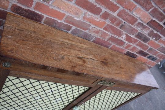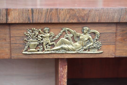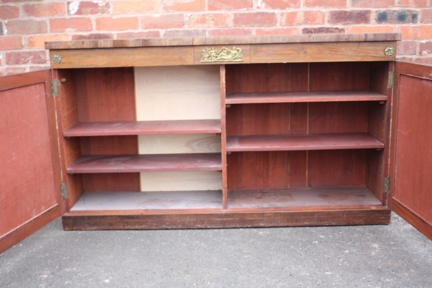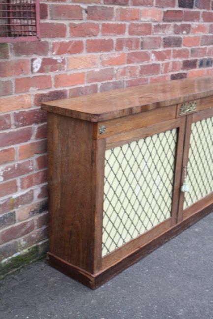 AN ANTIQUE ROSEWOOD TWO DOOR SIDEBOARD, having a classical gilt metal mount to the frieze, the doors with gilt lattice detail and fabric covered panels, H 93 cm, W 164 cm, D 37 cm
