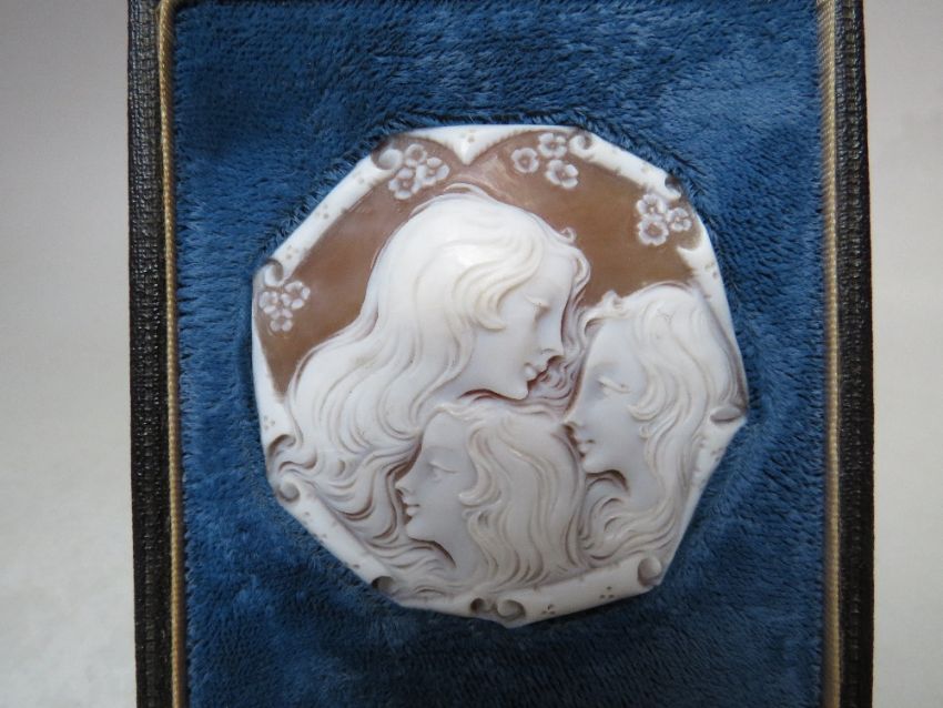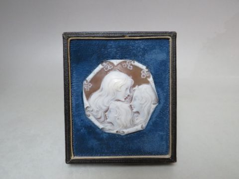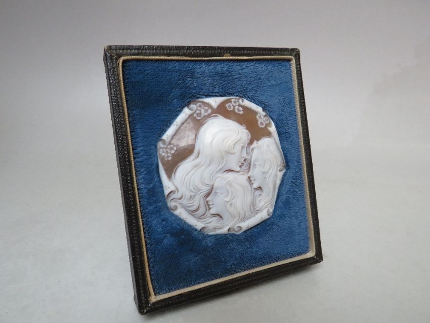 A FRAMED CARVED PORTRAIT CAMEO PLAQUE DEPICTING THE THREE GRACES, the cameo of octagonal form, in velvet mount fitted in an easel back frame, cameo Dia. 6 cm, frame approx H 10.5 cm, W 9 cm, D 2 cm