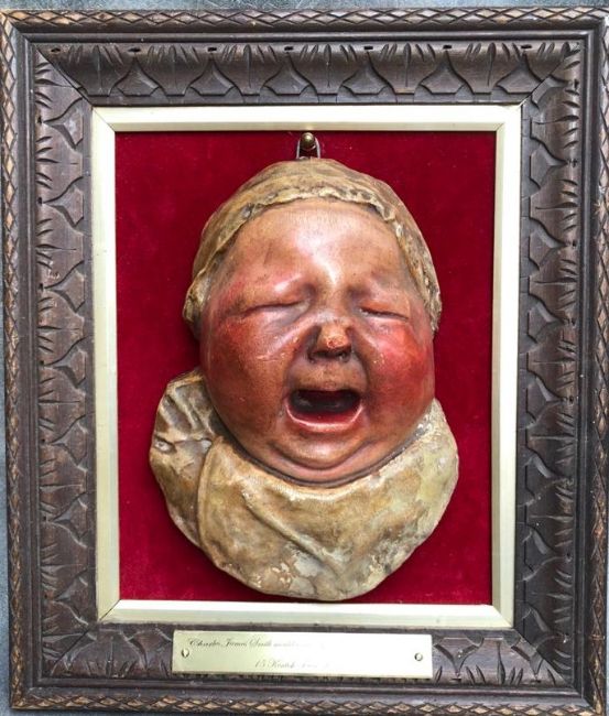 A LATE VICTORIAN PLASTER POLYCHROME BUST OF A CRYING BABY BY CHARLES JAMES SMITH, the painted bust with suspension loop hung in a carved oak frame with brass inscription plate, red velvet backing and turned brass support, bust inscribed below neck, H 40 cm, W 34 cm.