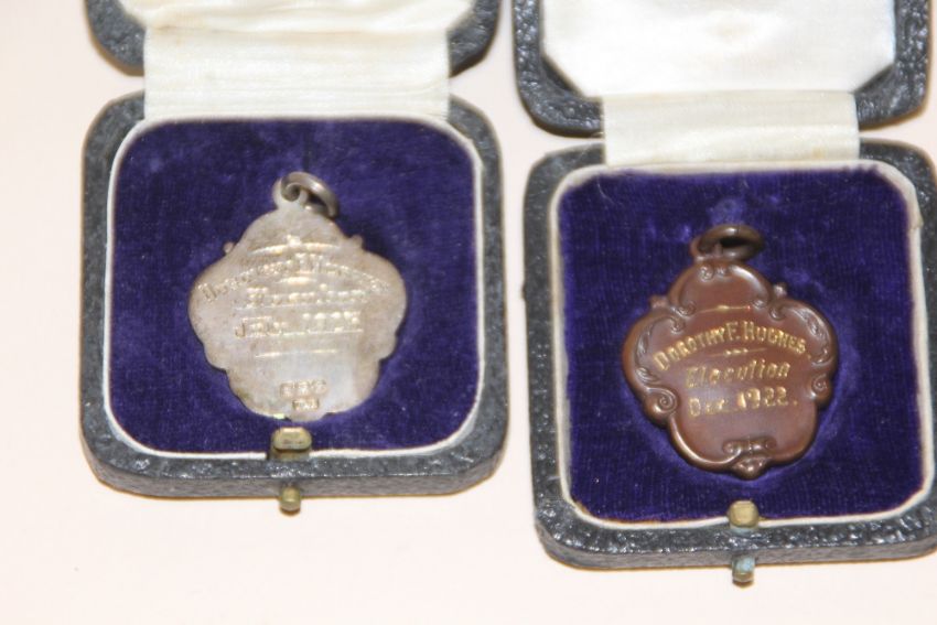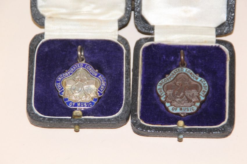 A CASED HALLMARKED SILVER AND ENAMEL FOR 'THE INCORPORATED LONDON ACADEMY OF MUSIC' FOB MEDAL TOGETHER WITH ANOTHER AND A H J BOSTOCK CASED MEDALLION